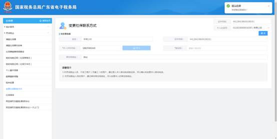 b) 在【待变更信息】中,编辑需要变更的信息后,点击【发送验证码】按钮,系统提示“发送验证码成功!”,本人手机号码将会收到验证码短信;