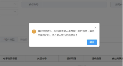 2.1如未录入存款账户,会提示“尊敬的缴费人,您当前未录入退费银行账户信息,请点击确定后,进入录入银行信息界面”。