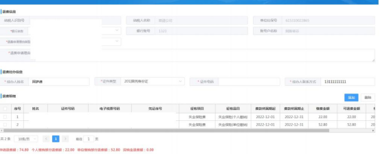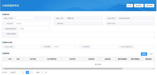 3.进入【社保费退费申请】受理界面后,选择退费账户信息、退费申请理由类型,录入退费经办人信息后,点击添加进入查询退费明细界面。
