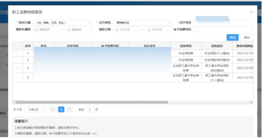 4、在【职工退费明细查询】界面选择险种归属、证件类型、证件号码、费款所属期起止、缴款日期起止、电子税票号码等,勾选需要退费的记录,点击添加,在受理界面生成应退信息。目前起止时间间隔不能超过 6 个月。