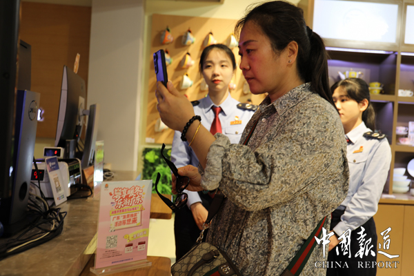 游客在税务干部辅导下参与“有奖发票”活动。(通讯员供图)
