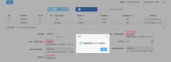 1.2免租金期止从价信息维护。【房屋应税信息(从价)】页面,打开已采集的从价信息,维护【出租房产原值】和【出租房产面积】为免租金前数据,【变更时间】为免租金期满当月任意一天(如:2020-03-31,不得早于当前时间,待免租金期满时录入),保存,从价信息维护完成。