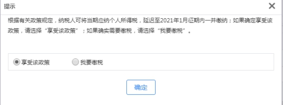 根据有关政策规定,纳税人可将当期应纳个人所得税,延迟至2021年1月征期内一并缴纳;如果确定享受该政策,请选择‘享受该政策’;如果确实需要缴税,请选择‘我要缴税’。”