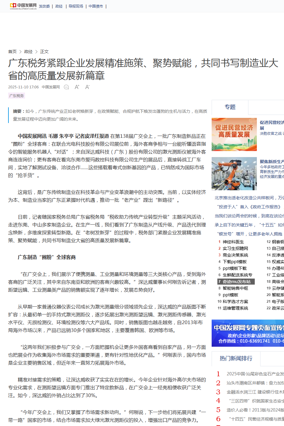 “在广交会上,我们展示了便携测量、工业测量和环境测量等三大类核心产品,受到海外客商的广泛关注,其中来自东南亚和欧洲的客商兴趣较高。”深达威董事长何刚告诉记者,测距望远镜、工业测量类产品的销售额实现了逐年增长,发展态势良好。