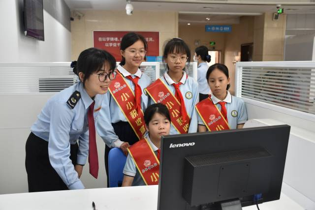 图为税务人员向小小税收宣传员展示网上办税服务。
