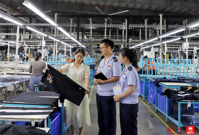 税务人员走访高新技术企业茂名佳都服装科技集团有限公司,了解企业生产经营情况,送上税惠政策。(萧晓红摄)