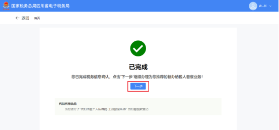 ④系统跳转已完成界面,并提示:“您已完成税务信息确认,点击‘下一步’继续办理为您推荐的新办纳税人套餐业务!”。点击【下一步】。