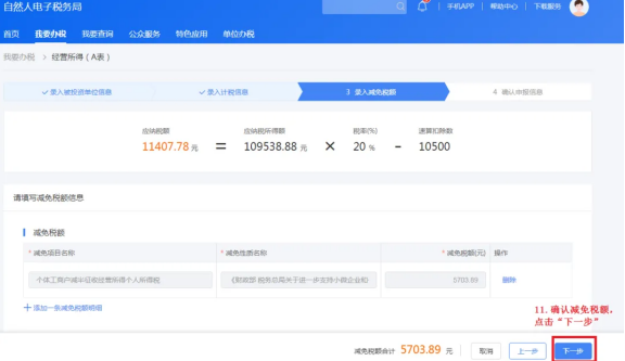 选择具体减免项目,确认减免税额无误后点击“下一步”。