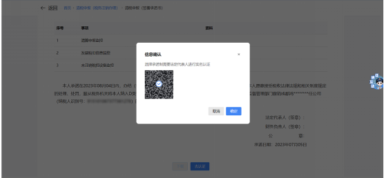c.弹出二维码认证窗口,系统提示“选择承诺制需要法定代表人进行实名认证”,点击【确定】。