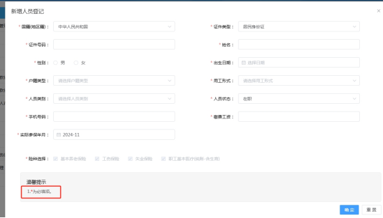 步骤3:点击【新增人员】,弹出“新增人员登记”页面,弹出“新增人员登记”页面。完善新增人员信息,填写完成后,点击【确定】。
