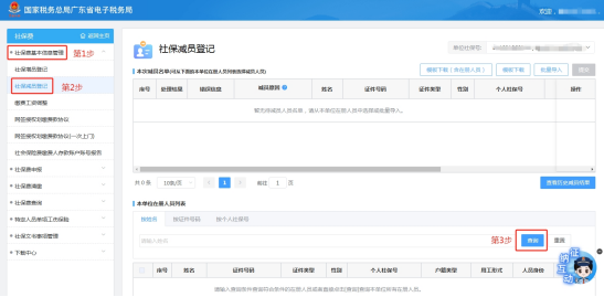 1.登录全国统一规范的电子税务局(网址http://guangdong.chinatax.gov.cn):【我要办税】→【社保费业务】→【社保网报】(或者在首页面中间位置的热门服务中点击【社保费业务】)→【社保费基本信息管理】→【社保减员登记】,点击查询按钮,或者选择姓名、证件号码、个人社保号其中一项内容进行填写后,勾选对应减员的对象,选择减员原因后点击【提交】,即完成减员操作。 |