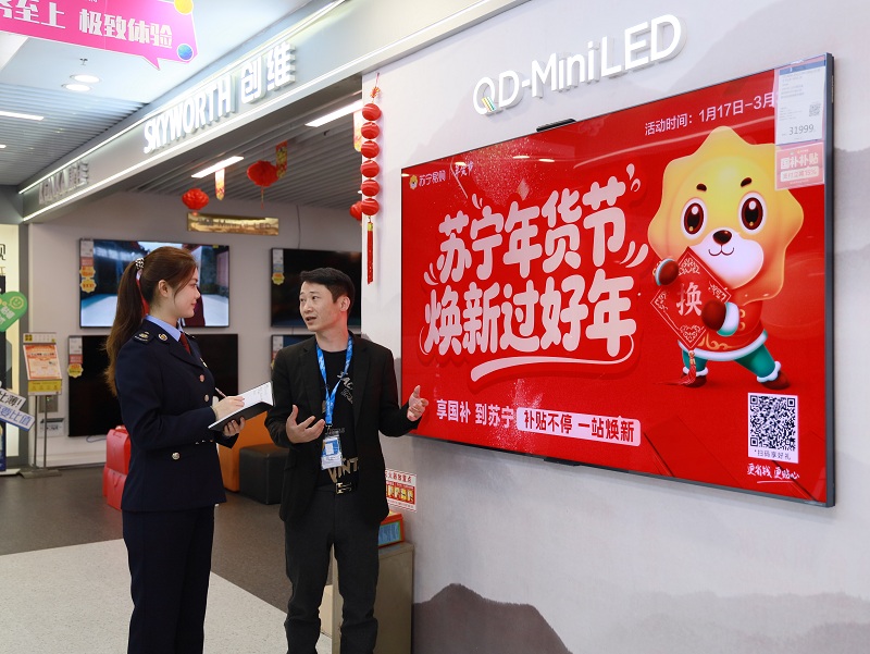 春节消费旺季,国家以旧换新等补贴政策正火热落地。佛山市禅城区税务局税务人员走访苏宁易购等大型家电数码零售门店,宣传税费政策,引导商户合规使用发票,助力消费市场活力释放。税务人员现场向销售人员了解家电以旧换新销售情况。