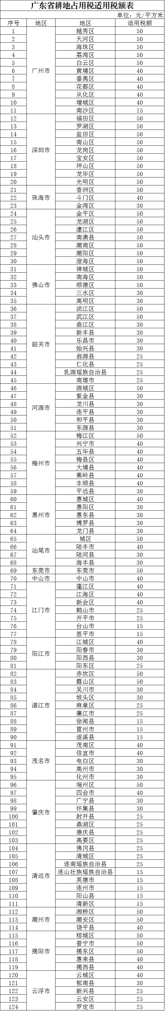 7月25日,《广东省人民代表大会常务委员会关于广东省耕地占用税适用税额的决定》(以下简称《决定》)由广东省人民代表大会常务委员会第十三次会议审议通过。自2019年9月1日《中华人民共和国耕地占用税法》(以下简称《耕地占用税法》)施行之日起,广东省将适用新的耕地占用税税额标准,共有5种适用税额,分别为15、25、30、40、50元/平方米。具体适用税额详见附表。