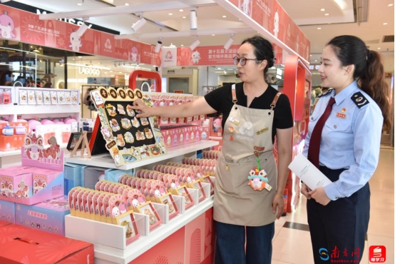 “青税先锋”宣传员走进十五运会特许商品零售企业介绍最新相关税收优惠政策。通讯员供图
