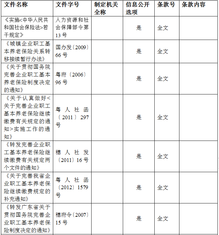 3.《关于完善我省企业职工基本养老保险继续缴费规定的补充通知》(粤人社函〔2012〕1579号)规定:一、《社会保险法》实施后达到法定退休年龄但参加养老保险缴费年限未达到按月领取基本养老金条件,且按照《国务院办公厅关于转发人力资源和社会保障部财政部城镇企业职工基本养老保险关系转移接续暂行办法的通知》(国发〔2009〕66号)确定广东省为待遇领取地的参保人,本省户籍的按《关于贯彻国务院完善企业职工基本养老保险制度决定的通知》(粤府〔2006〕96号,以下简称96号文)第三条第(四)项第二款的规定确定继续缴费地;外省户籍的在最后参保地按规定继续缴费;继续缴费地一经确定不再改变。二、按月继续缴费的标准按96号文的规定执行,即“参照城镇个体工商户和灵活就业人员的费基、费率继续缴费”。