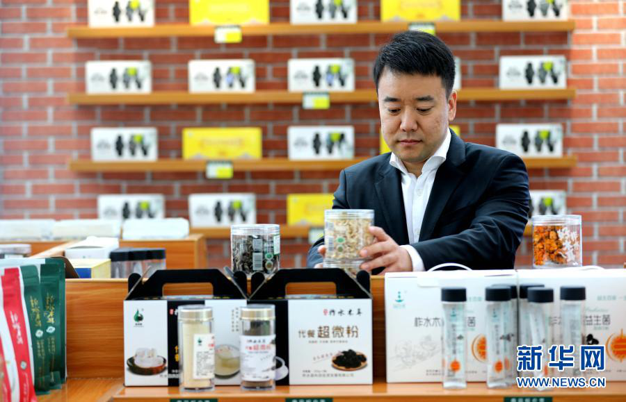 2020年4月21日,秦岭天下电子商务有限公司总经理赵少康在金米村培训中心整理货架。新华社记者 梁爱平 摄