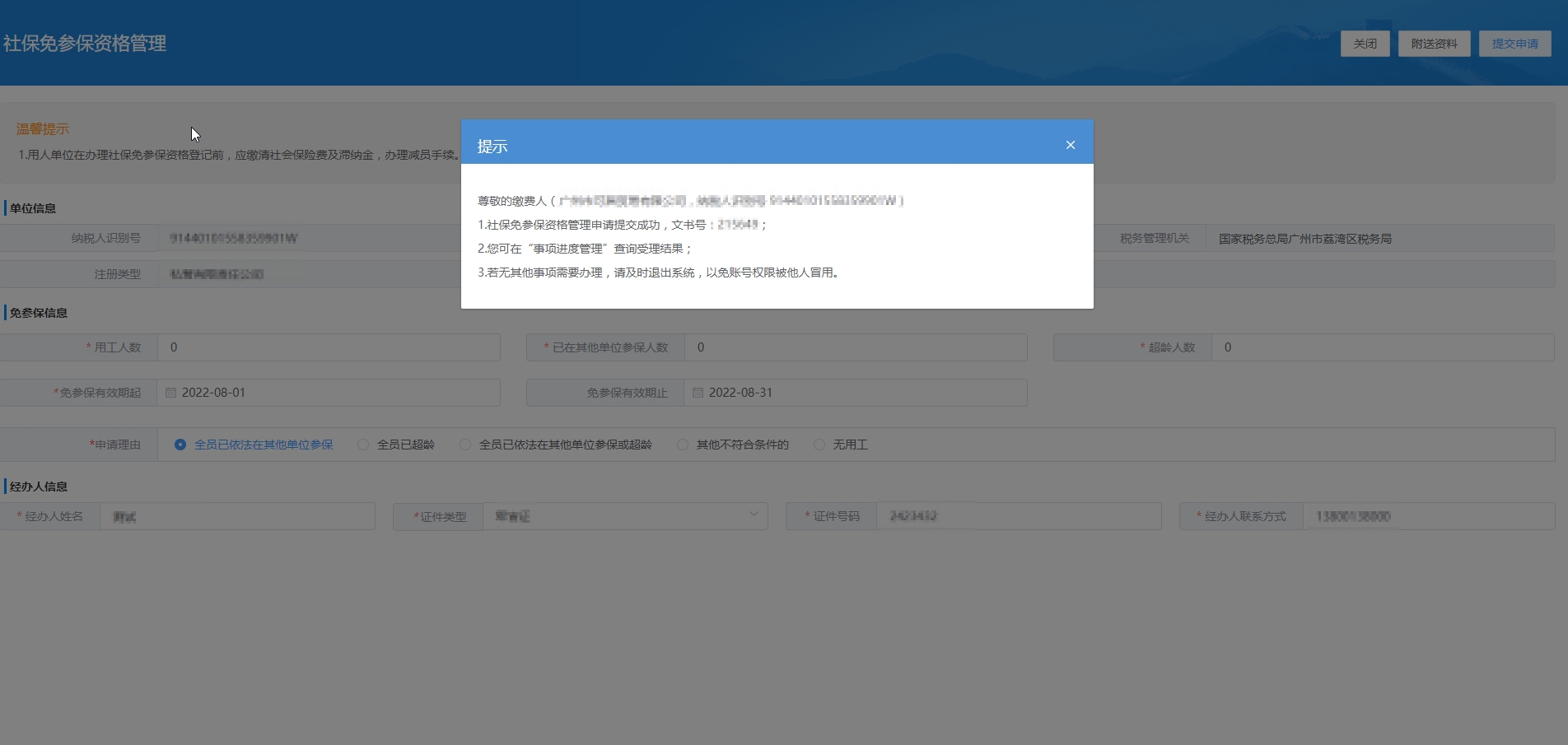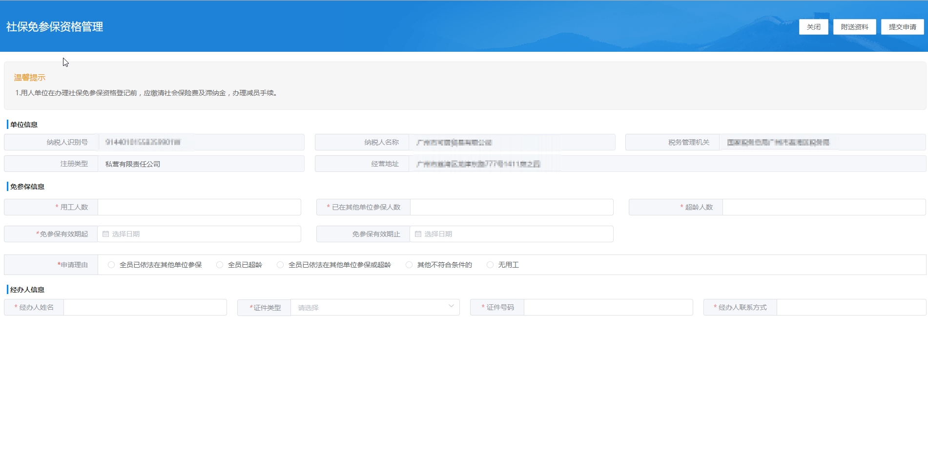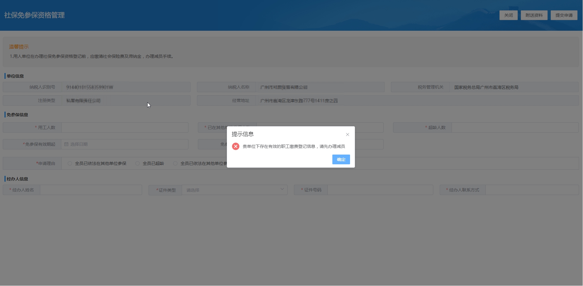 已办理缴费登记的用人单位,其所有职工已依法参保、已办理退休或超过法定退休年龄等致使该单位名下没有人员需要参保的,由用人单位向主管税务机关申请办理免缴费登记认定。