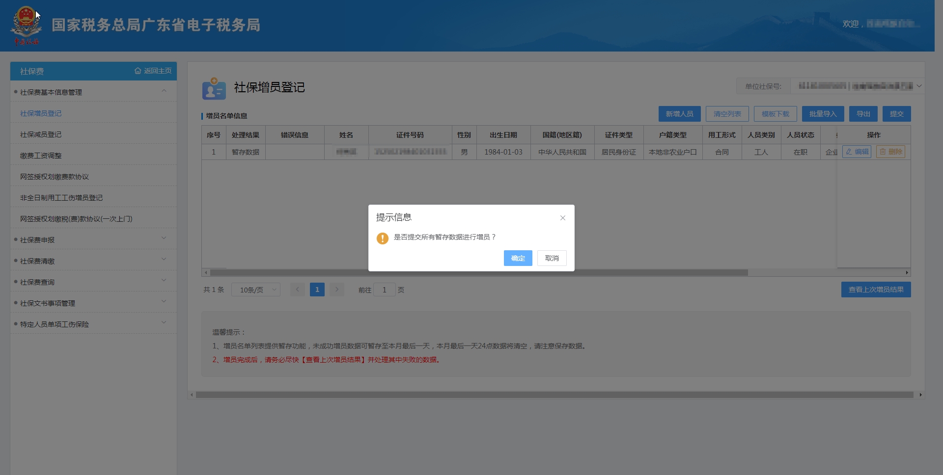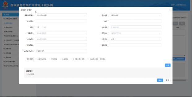 功能位置:广东省电子税务局【我要办税】【税费申报及缴纳】【社保费管理】->【社保费基本信息管理】【社保增员登记】