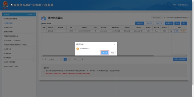 (4)点击【确定】按钮,提示信息页面关闭,新增的人员信息暂时保存在【增员名单信息】列表。