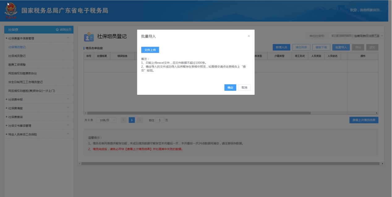 (2)点击【批量导入】按钮,选择已经编辑好的增员名单文件上传;
