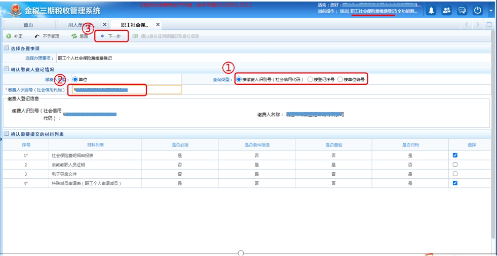 (2)选择按缴费人识别号(社会信用代码)、按登记序号或者按单位编号方式进行录入,可以按缴费人识别号(社会信用代码),输入纳税人识别号后按回车,带出用人单位信息;可以选择按登记序号,输入登记序号后按回车,带出用人单位信息;也可以选择按单位编号,输入单位编号后按回车,带出用人单位信息。点击下一步,进入功能主界面。