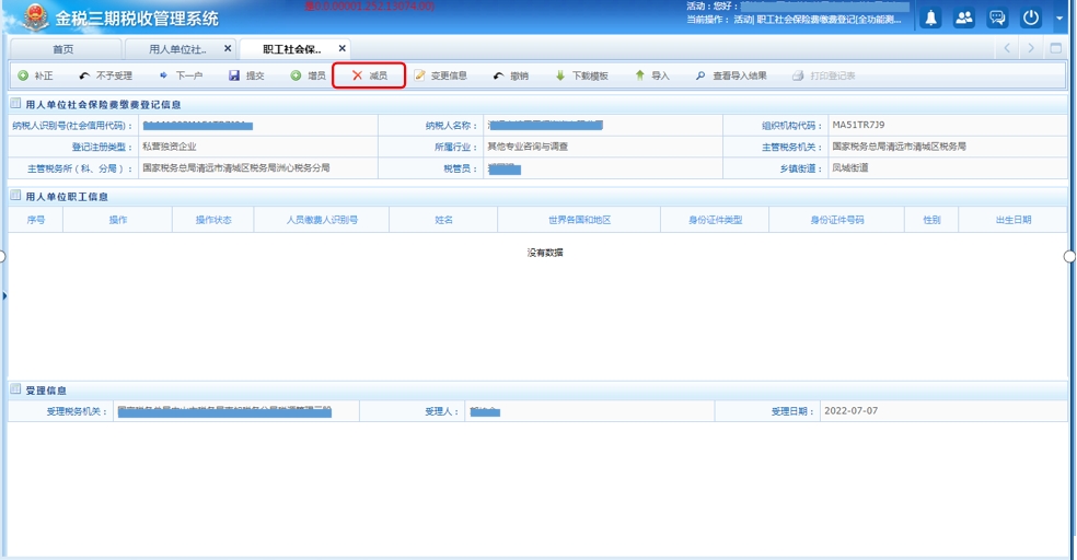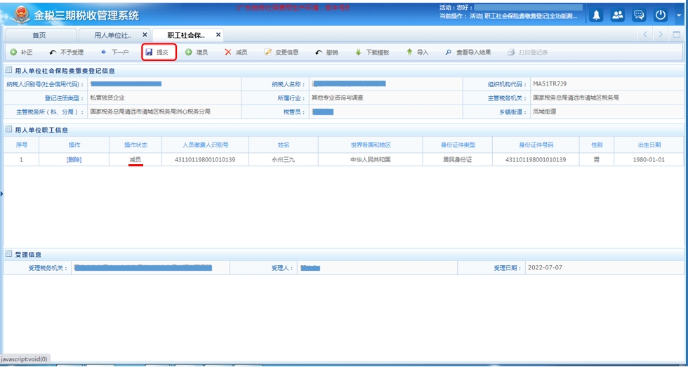 (5)当需要减员的人员已经全部手工修改完成后,点击主界面“提交”保存信息。