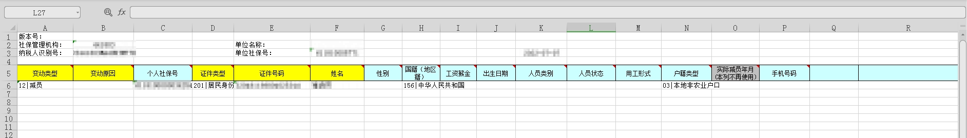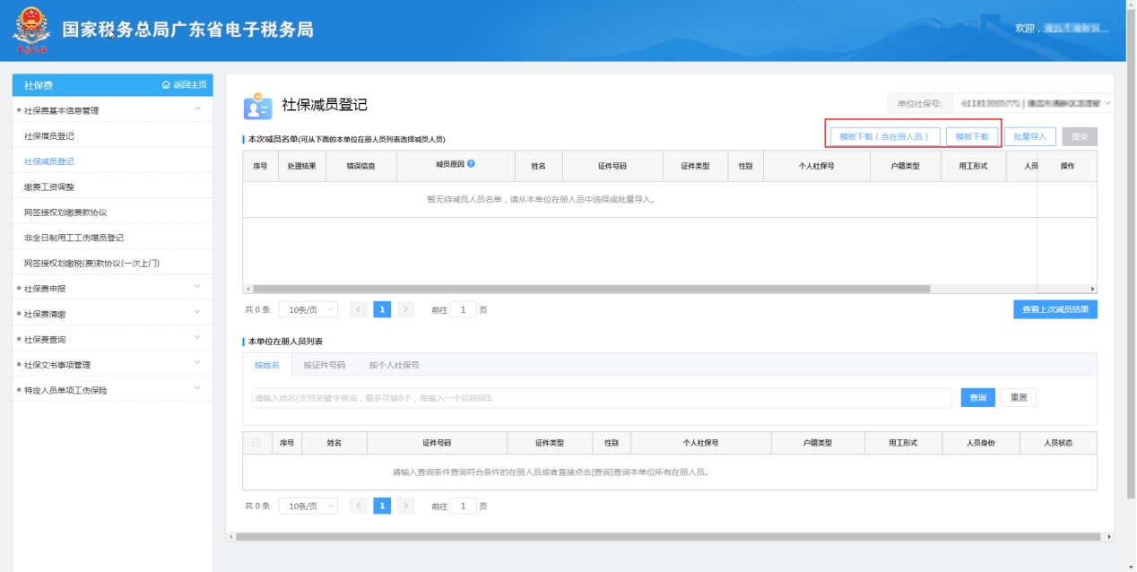 (1)点击【模板下载(含在册人员)】按钮下载本单位在册人员信息文件到本地,删除无需减员的数据,保留需减员人员;或者点击【模板下载】按钮下载空模板,录入需减员人员信息。