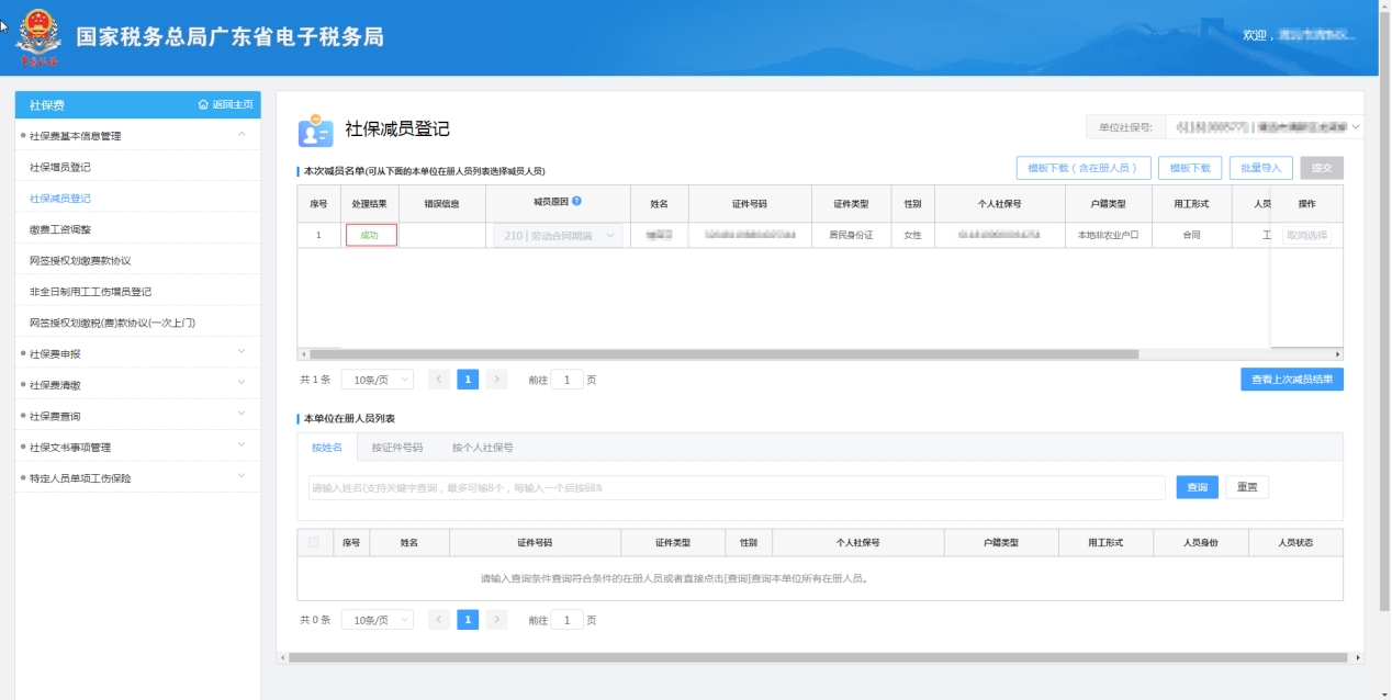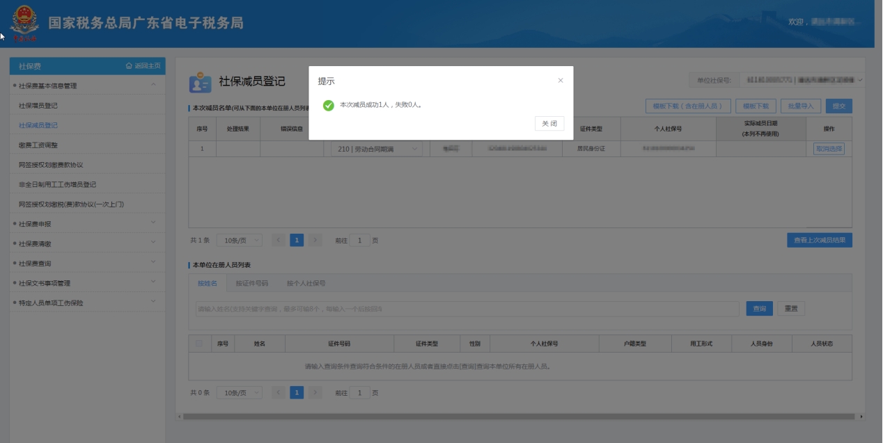 (3)确认导入的减员名单信息无误后,点击【提交】,提示减员成功。