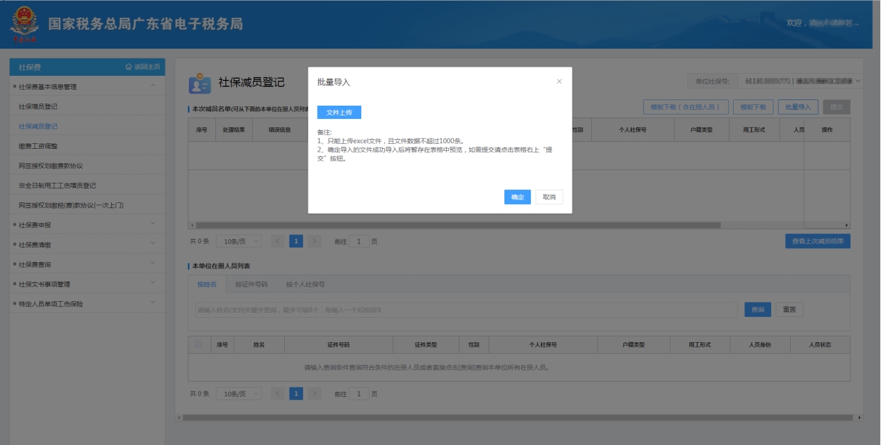 (2)点击【批量导入】按钮,选择已经编辑好的减员模板文件上传。