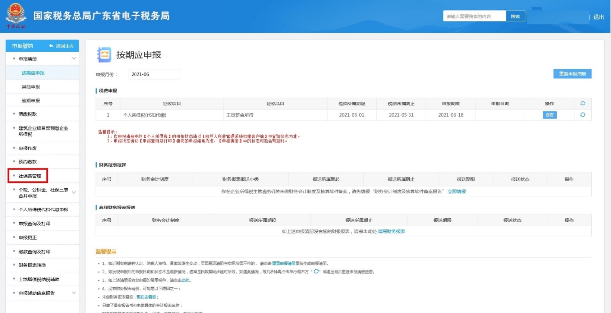 广东省电子税务局 — 广东省电子税务局—企业业务—首页菜单—右边菜单栏—我要办税—申报缴纳—社保费管理 |