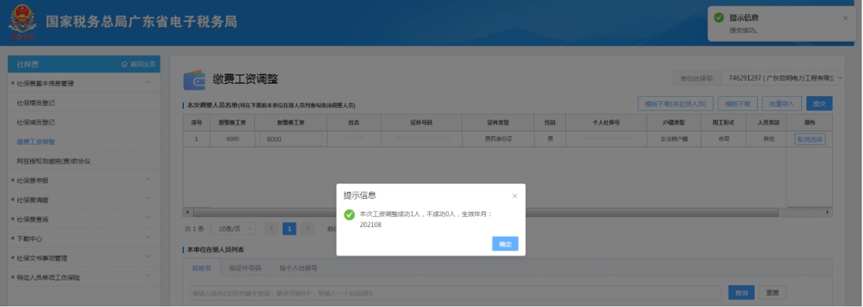 (3) 在【本次调整人员名单】的待工资调整人员填写“新缴费工资”,填写完成后,点击【提交】,弹出“提交确认”对话窗口,点击【确定】,系统校验【本次调整人员名单】的待工资调整信息,若校验成功,返回提示:“提交成功。”;若校验不成功,则返回提示