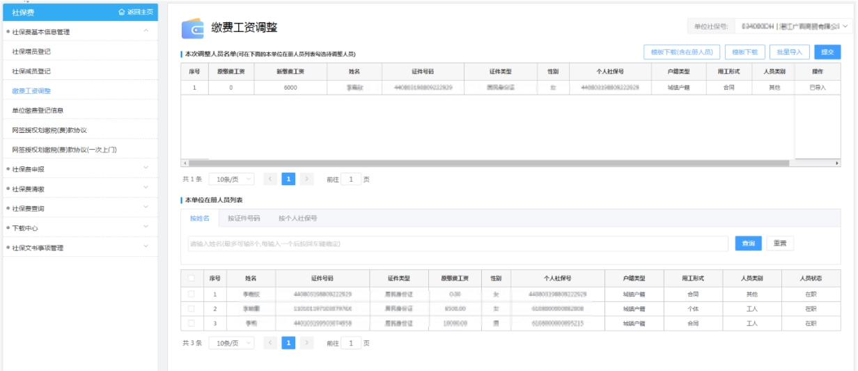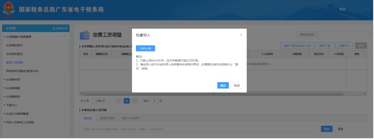 (2)点击【批量导入】,选择已经编辑好缴费工资调整的人员名单文件上传。