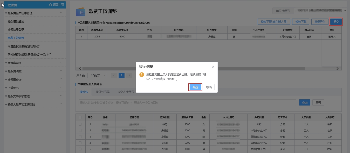 (3)在【本次调整人员名单】预览上传的缴费工资调整信息,确认无误后,点击【提交】,弹出“提交确认”对话窗口,点击【确定】,系统校验【本次调整人员名单】的待工资调整信息,若校验成功,返回提示:“提交成功。”;若校验不成功,则返回提示。