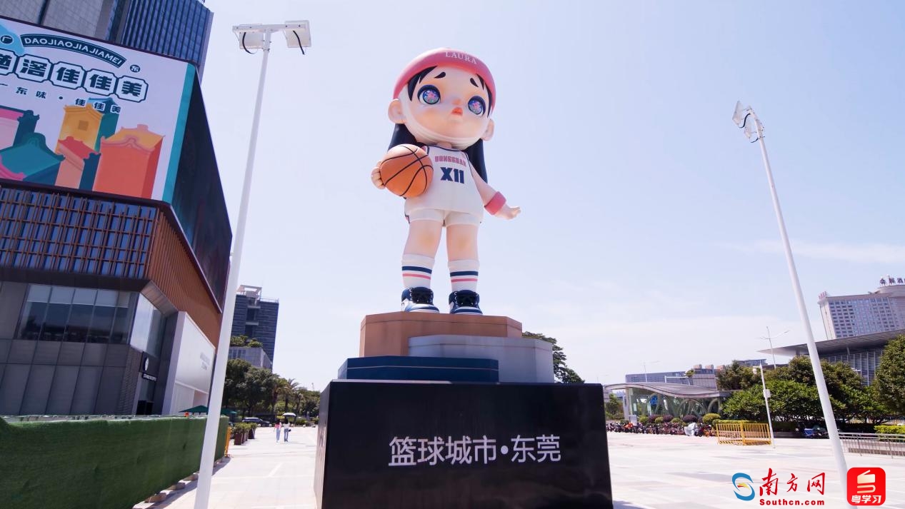 9月,2024广东省男子篮球联赛火热开打。作为“篮球城市”东莞,“莞篮村BA”“厂BA”两大民间篮球赛事当属全城热事。据统计,截至2023年底,东莞有记录在册篮球场达6900多个,培育了闻名全国的CBA明星球队广东宏远队,全市每年举办各类篮球赛事超1000场。从星光熠熠的篮球世界杯,到卧虎藏龙的市镇村各级联赛,再到各学龄段全覆盖的校园联赛,篮球已融入东莞市民的生活,也成为当地特色文创的重要“灵感”。在东莞银行篮球中心旁边的商店里,宏远俱乐部的球员动漫形象产品、华南虎毛绒玩具、钥匙扣、手环、背包、帽子等文创产品琳琅满目,前来购买的球迷粉丝络绎不绝。行驶在东莞大道上,人们还能一眼就看到一个身高12米、抱着篮球、身穿球衣、眨着星星眼的篮球宝贝劳拉(Laura)潮玩“骄傲”地站在全城最热闹的商圈中央。