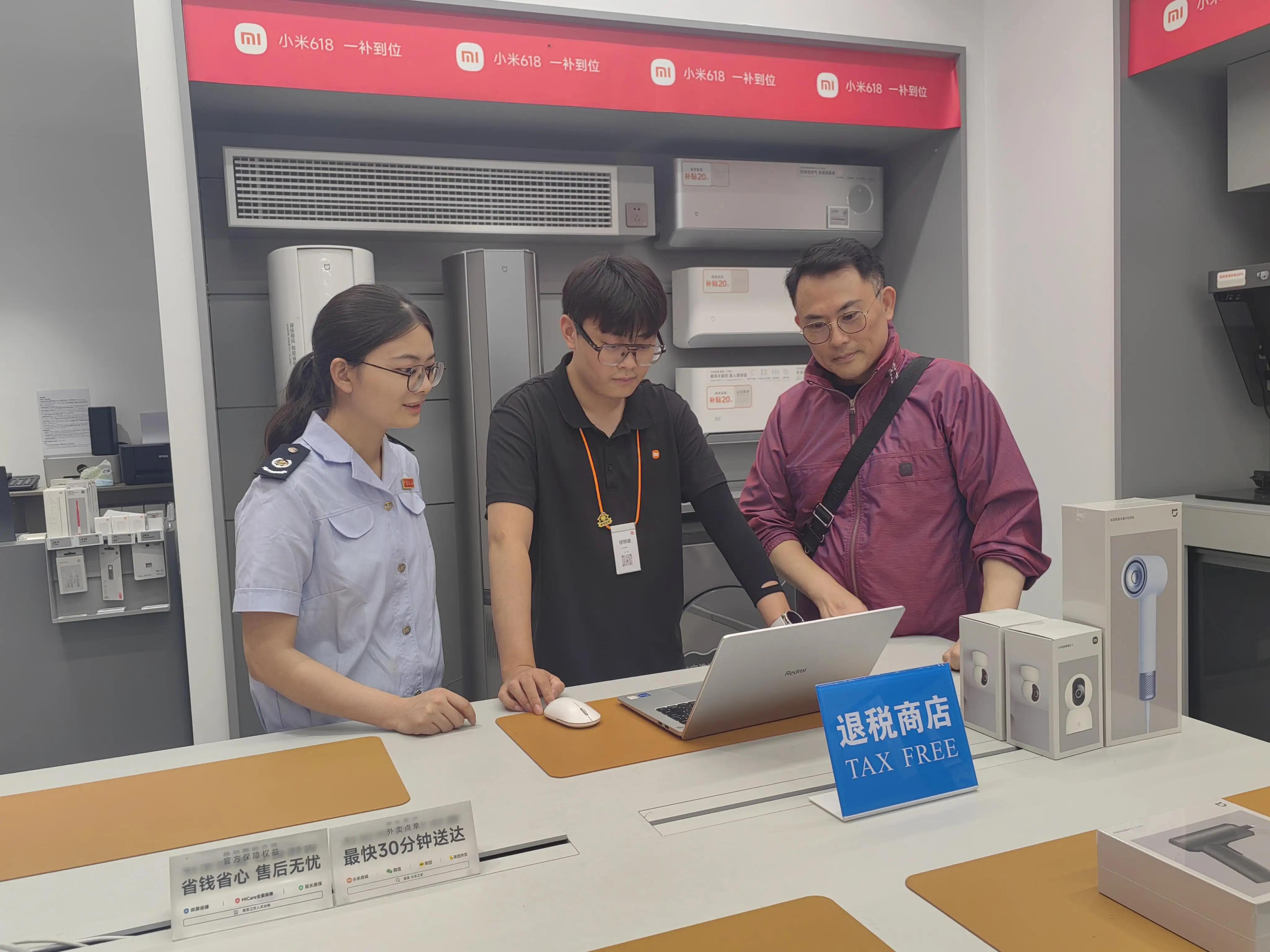 6月12日,香港旅客伍先生在小米退税商店购买清洁器具、除螨仪等产品,成为在退税商店消费的第一个境外旅客,该店也顺利开具出全市第一张离境退税申请单。