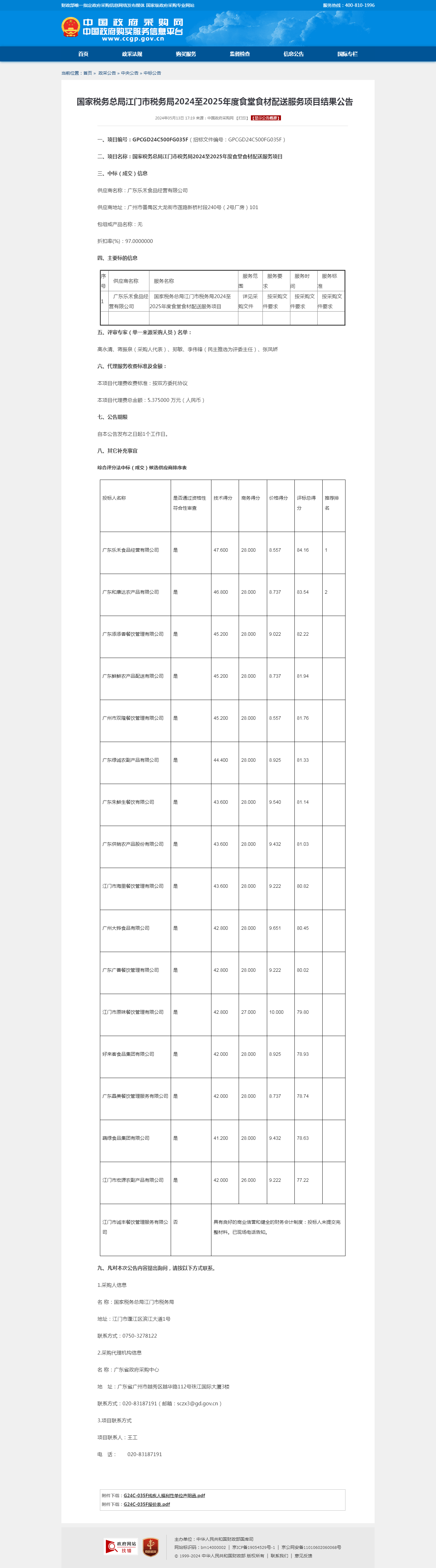 国家税务总局江门市税务局2024至2025年度食堂食材配送服务项目结果公告