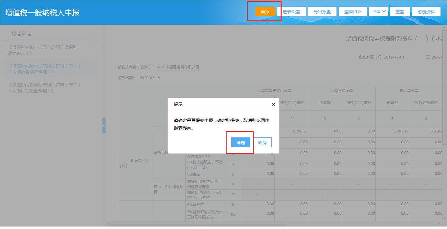 4.如果纳税人选择在线完成更正申报,更正相应栏次数据后,点击【申报】,系统提示再次确认是否提交,如果纳税人确认无误,即可点击【确定】,提交更正数据。