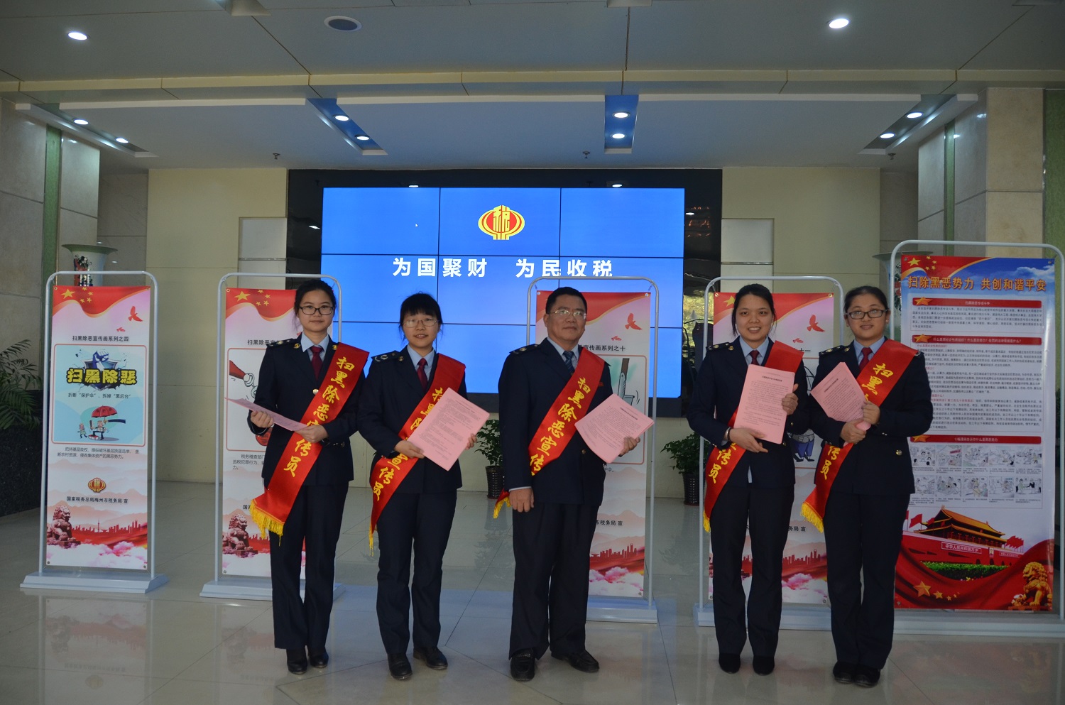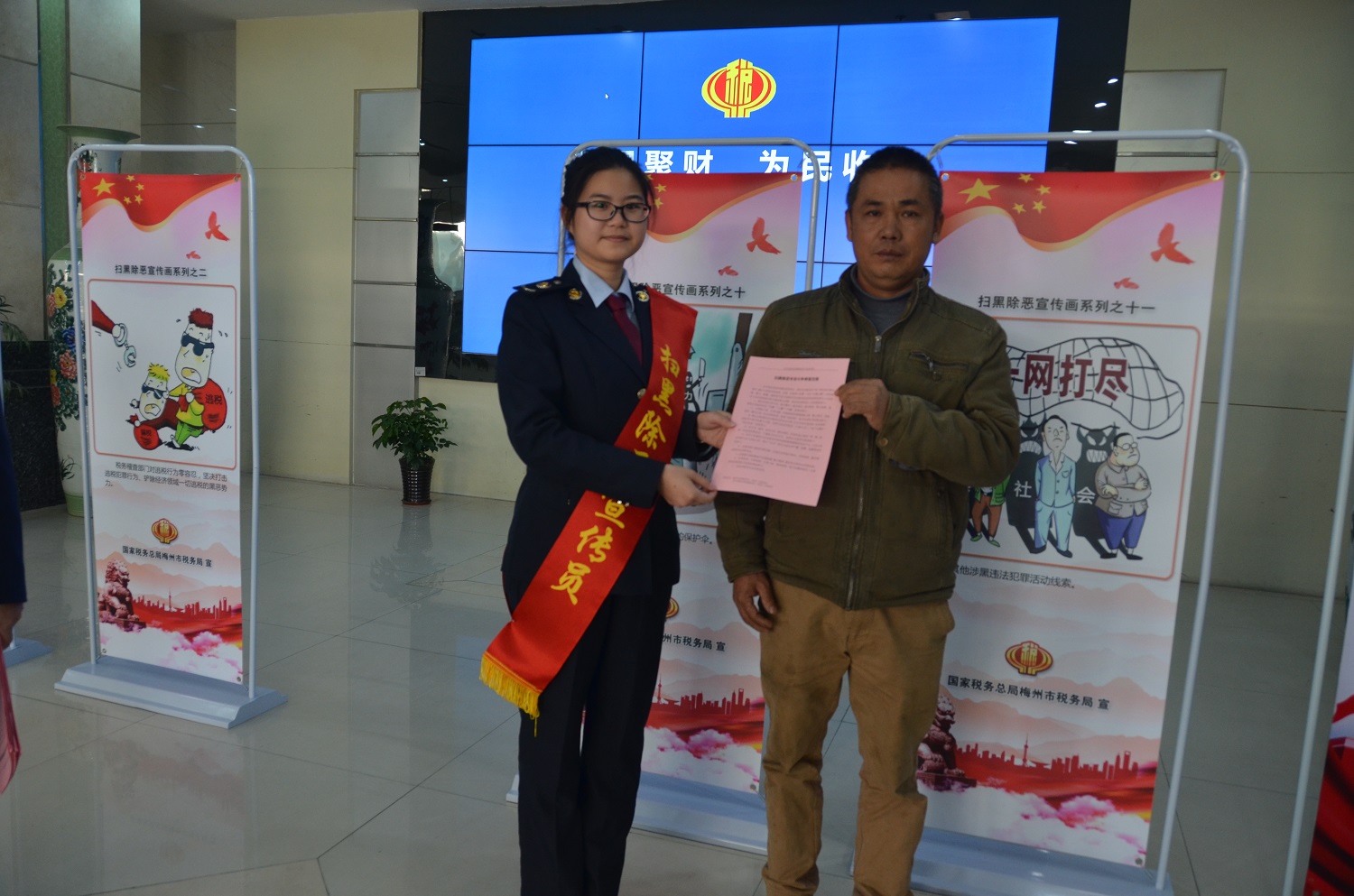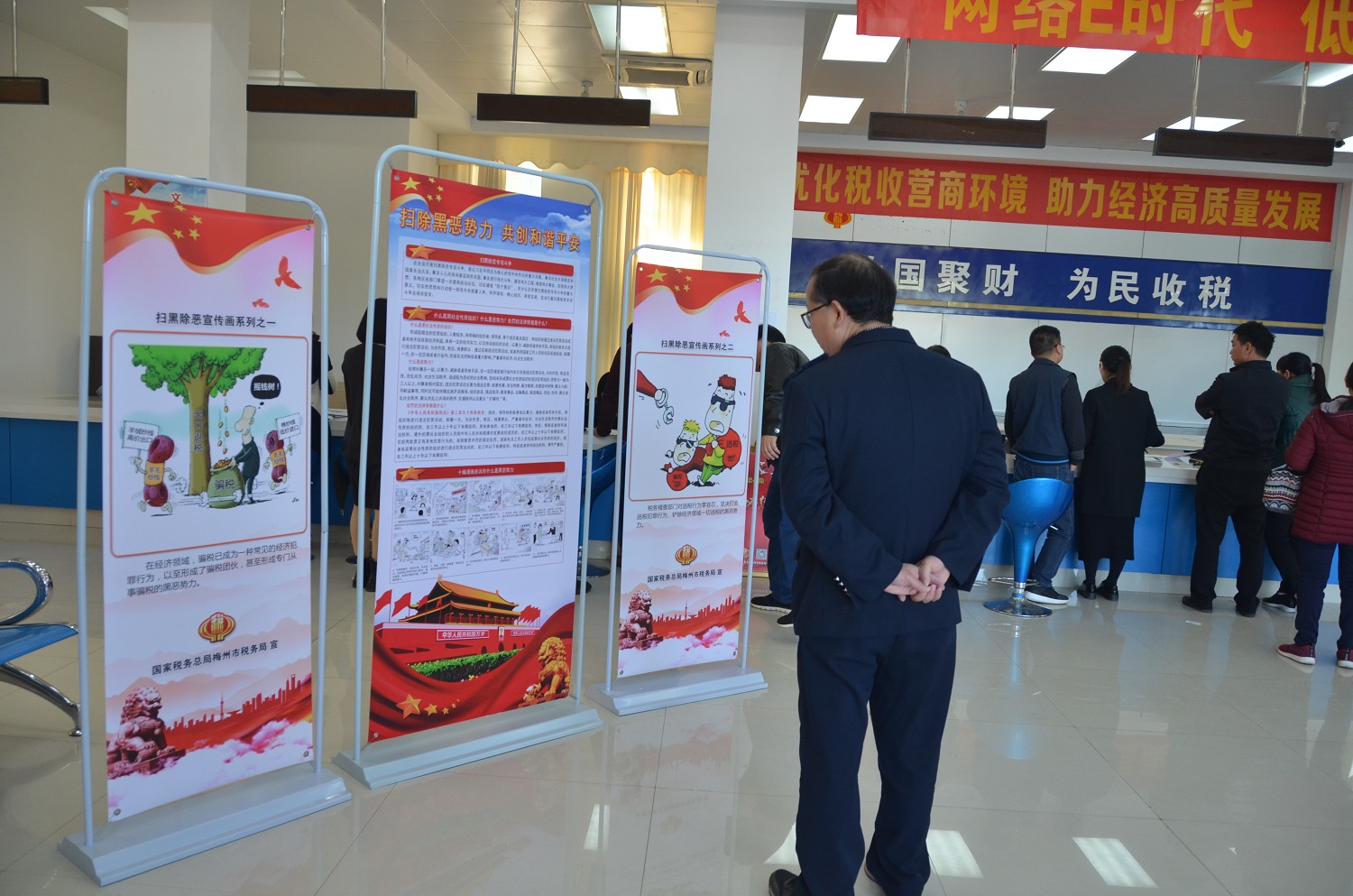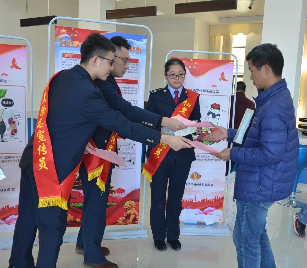 活动中,兴宁局采取传统方式和新媒体全方位、城区与乡镇全覆盖的宣传策略,一是组织青年税务干部成立扫黑除恶宣传志愿者队伍,在人群密集的各大办税服务厅面对面向办事群众讲解扫黑除恶重点知识、扫黑除恶举报奖励办法和举报保护机制,同时现场发放“扫黑除恶专项斗争知识点”和“扫黑除恶专项斗争举报范围等相关宣传资料,进一步加强人民群众对于黑恶势力的辨别区分与主动举报的积极性;二是在全市各税务办公地点悬挂扫黑除恶宣传标语横幅,在各办税服务厅内摆放宣传海报展架,在各办税服务厅醒目位置设置举报信箱;三是通过网站公告、微信公众号、办税厅电子滚动屏等新兴宣传形式通过多层次全方位扎牢宣传基础,进一步提高我市人民群众对扫黑除恶专项斗争的知晓率和参与率,为共建美好城市筑牢精神根基。