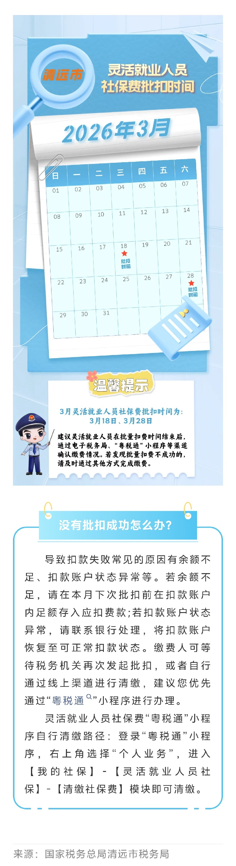 2026年3月清远市灵活就业人员社保费批扣时间安排