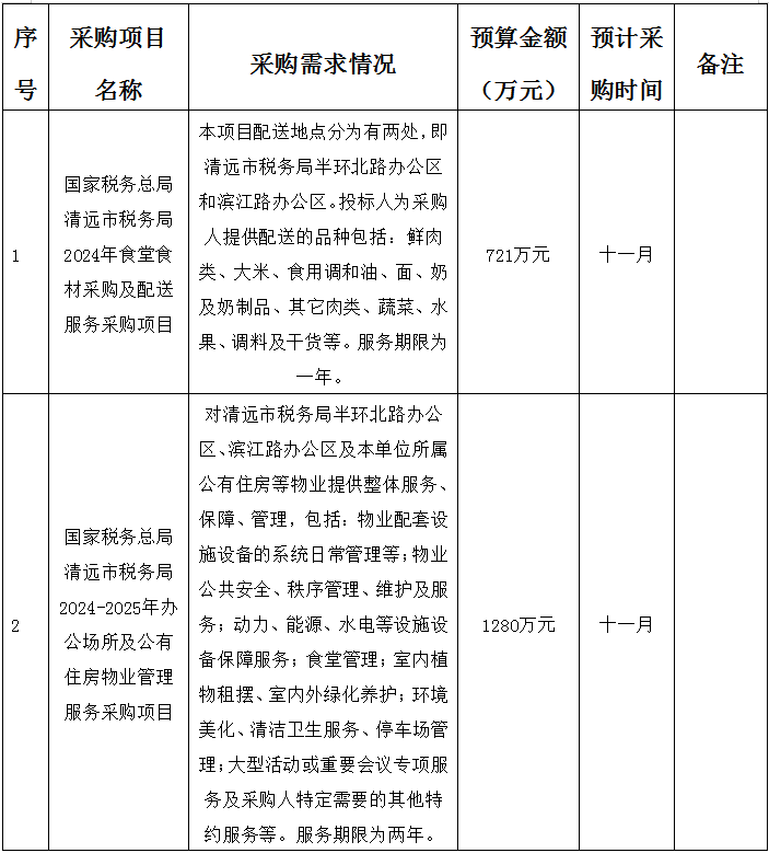 为便于供应商及时了解政府采购信息,根据《财政部关于开展政府采购意向公开工作的通知》(财库〔2020〕10号)等有关规定,现将国家税务总局清远市税务局2023年第四季度采购意向公开如下: