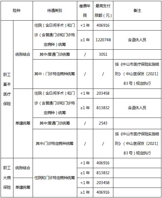 根据《中山市职工医疗保险办法》(中府〔2021〕87号)、《关于贯彻广东省职工基本医疗保险门诊共济保障实施办法的通知》(中府〔2022〕115号)和《关于落实广东省医疗保障待遇清单制度的通知》(中府〔2022〕133号)的规定,结合2022年全口径城镇单位就业人员月平均工资,现公布2024医保年度我市职工基本医疗保险缴费基数上下限、费率和医疗保险年度最高支付限额,详见附件,请遵照执行。