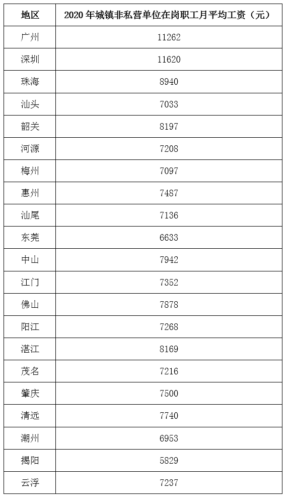 附件:广东省各市2020年城镇非私营单位在岗职工月平均工资情况表