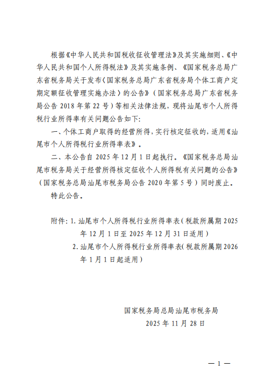 附件1:汕尾市个人所得税行业所得率表(税款所属期2025年12月1日至2025年12月31日适用).pdf