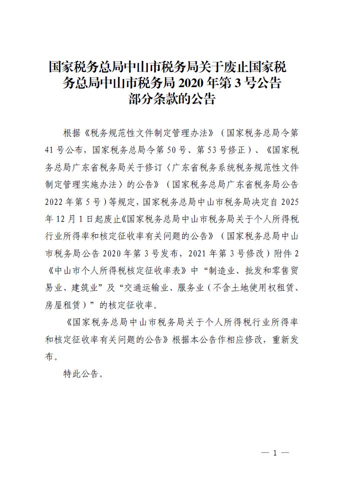国家税务总局中山市税务局关于废止国家税务总局中山市税务局2020年第3号公告部分条款的公告