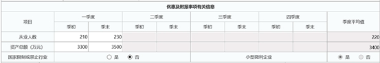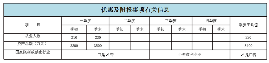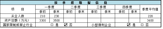 1.信息填报。填报第一季度至税款所属季度各季度的季初、季末、季度平均从业人员的数量及资产总额的金额。季度中间开业的纳税人,填报开业季度至税款所属季度各季度的季初、季末的数据,其中开业季度“季初”填报开业时的数据。季度中间停止经营的纳税人,填报第一季度至停止经营季度各季度的季初、季末的数据,其中停止经营季度“季末”填报停止经营时的数据。“季度平均值”填报截至本税款所属期末的季度平均值。勾选是否从事行业为国家限制或禁止行业,根据前述标准判断符合享受小型微利优惠条件的,“小型微利企业”栏次勾选“是”。