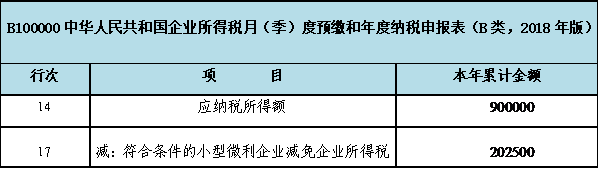 3.申报表填写。 在B100000主表第14行“应纳税所得额”处填报90万元,第17行“减:符合条件的小型微利企业减免企业所得税”填报减免税额20.25万元。