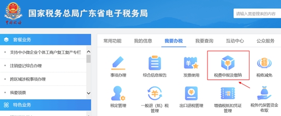 第一步:登陆“国家税务总局广东省电子税务局”,选择“我要办税——税费申报及缴纳”:
