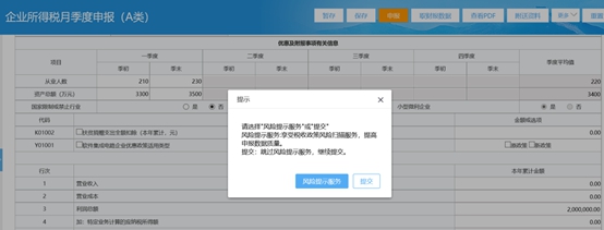 第六步:填写完毕后点击“申报”,可选择是否接受“风险提示服务”或“提交”:
