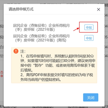 第三步:在弹出的对话框中选择“申报方式”,选择“在线申报”或“离线申报”,点击“申报”: