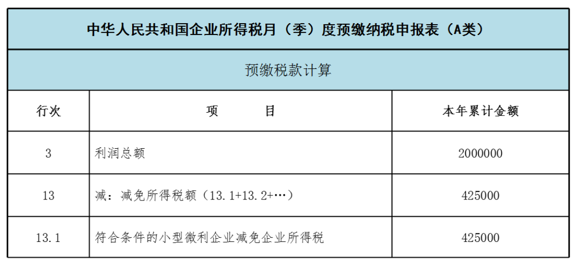 3.申报表填写。在A200000主表第3行“利润总额” 处填写200万元,根据《企业所得税申报事项目录》,在第13.1行选择填报“符合条件的小型微利企业减免企业所得税”项目,填写本年累计减免金额42.5万元,该金额同时反映在第13行“减免所得税额”。